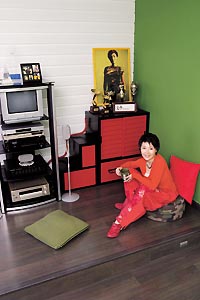 张迈用来做工作室的房间,是这个房子里的一个另类空间。她给这个空间起了个可爱的名字:“麦子音乐推广”。柔和的颜色在这里没有任何过渡,直接变成了纯粹的绿、深沉的灰、热烈的红、前卫的迷彩……墙上到处是张迈的演出照片,陈列架上是一座座展示张迈歌唱事业骄人成绩的奖杯,另一侧墙边是办公桌和各种文件,整个就是一个简洁的现代OFFICE。这个工作室,主要是张迈和助手用来打理自己的演艺事业,她希望这是一个纯粹的工作空间,有工作气氛、有效率感,工作与生活应该是两种不同的态度。