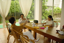 乘一个多小时的汽车到达尚涛在郊外的家,迎接我们的是他那美丽的妻子廖慧兰教授。廖教授领我们楼上楼下、屋前屋后看遍,然后,在游泳池边的饭厅落座,品香茗,聊家居,浓浓的艺术气息,扑面而来——