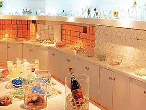 居室的墙面刷成冷色调,居室中摆放新型玻璃器皿,如玻璃博古架,架上摆放玻璃工艺品;玻璃酒柜,柜中摆放酒瓶、酒杯;玻璃餐桌,桌上摆放玻璃茶具等。在居有装饰一扇普通的镜子屏,屏风曲折摆放,可使镜面像一个万花筒似地折射来自室内多面的色彩。将镜子上做立体抛光的刻花,其晶莹剔透之感其它材质无可替代,不但能使之成为一件艺术品,而且在阳光下,它能将赤、橙、黄、绿、青、蓝、紫这7种色彩过滤,把镜子的光学潜力充分挖出来,再与室内的玻璃艺术品相衬托,能糅合艺术与环境的灵秀,为居室增添冰清玉洁的哈尔滨冰雕般的爽洁感,有迷人的浪漫色彩。此种装饰效果也适宜炎热的夏季。
