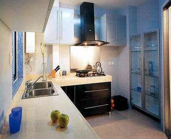 不规则的厨房内,错落有致地安顿了厨炊所需的一切,空间利用得合理又充分。