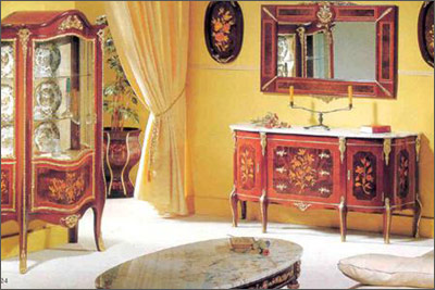 接近法国古典主义,借用建筑形式,有沉重的体量感,多用几何图形镶嵌以及皮革包衬和泡钉钉固。