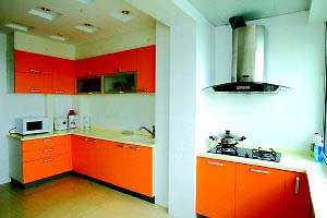 卧室以红色为主色调,而以橙色为主的橱柜让餐厅成为整套居室的点睛之笔,如果说现代式简约风格的设计过于普通,那么大胆运用色彩将让居室变得不普通。