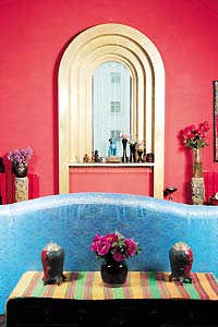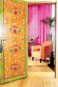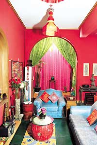 张聪和艳洁爱旅行,因为去过的地方很多,在装修自己房子的时候,他们就想把旅行中留下的美好记忆放在每天都看得到的地方。于是,他们没有像很多收藏者一样,把淘来的宝贝仔细地放置起来,而是将这些东西当成了美化家居的装饰品。来自尼泊尔的丝质靠垫随意地散落着,自己设计制作的沙发让人想起泰国那些鼓荡在风中的华美沙丽,金色的窗子,是几个拱形一层一层地叠进去,这种地中海风格的经典造型在房子中随处可见,来自西藏的巨大庙门装饰了楼梯边的一整面墙壁,还有从各地收集来的老家具和传统艺术品……每一处,都有不同国度的风情在旖旎着。