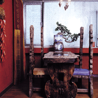 这样略施小计便独出心裁的例子多不胜数。客厅墙角的铁艺烛台,原本是一架铁艺的电灯,张咪将所有灯头都去掉,重新扭曲弯度,变成了现在这棵长满烛光的铁树。走廊里原本空旷的墙面,张咪用黑色丝绒缝制了一个大像框,再粘上羽毛,将自己一张颇具吉卜赛风格的照片嵌进去,完全成了一幅装饰画。值得一提的是张咪的餐桌,是在朋友的手工木坊里亲自动手设计的——桌面是将木头横剖,保留不规则的形状,然后再镂空嵌入玻璃,加上铜钉修饰,古朴而厚重。四把椅子更特别,一把椅子是一棵树,按照树木本来的形状打磨、镂空,造型别致。在这样的餐桌上就餐,绝对是眼睛和舌头的共同享受。